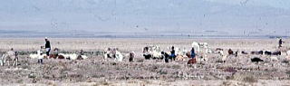 僅かな草を求めて、遊牧民は家族揃って移動します。家畜が彼ら最大の財産です。