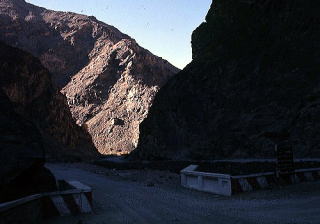 パキスタンとの国境、カイバル峠。ちょっと暗いですが橋状のところが国境になっています。