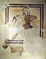 戦士を描いたものです。兜はトサカのような飾りがついています。盾と槍で武装です。