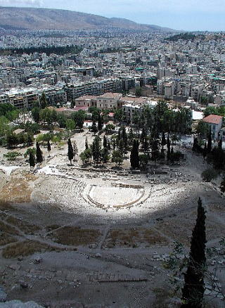 すぐ下には劇場があります(写真・左下)。夏の夜に今でも演劇があり、チケットはたいがい売り切れです。定宿のオヤジは、どうやらいいコネクションを持っているようで、アテネのほか、エピダブロスにも連れて行ってくれました。