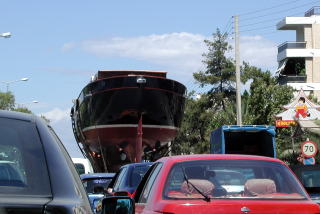 「あれは何だ!」と思わず声にしました。助手席にいたババも、しばらくは分かりませんでした。近づいてはっきりしました。船です。かなり大きな船をトレーラーで運んでいるのです。普通のレジャーボートを運ぶのは珍しくはありませんが、レジャー用ではありません。