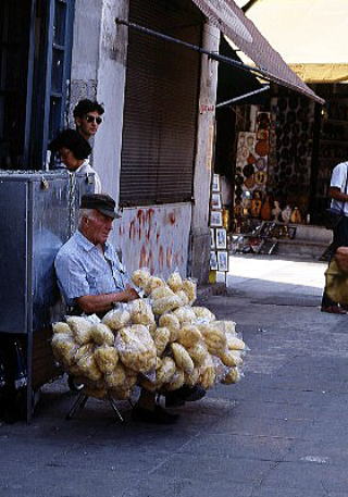 昔はアテネ市内に海綿売りがいました。店先だけでなく、道端にも出ていて、手頃で安いお土産のトップを占めていました。