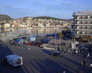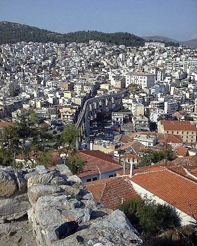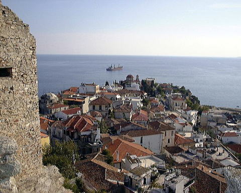 カヴァラの街の背後にある城跡からエーゲ海を見たところです(左)。昔ながらの家々が岬の先端まで続いていました。