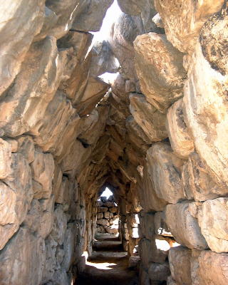 ティリンスの遺跡で発掘されているのはごく一部です。ギリシャの遺跡に付きものの、劇場や運動場が見当たりません。大きな石を積み重ねた、堂々とした入り口があり、神殿跡と思える場所へ行くのには、さらに門があり、石垣に沿って道があります。かなり厳重ですが、平地の小さな丘にあるので、きっとこうするしかなかったのでしょう。