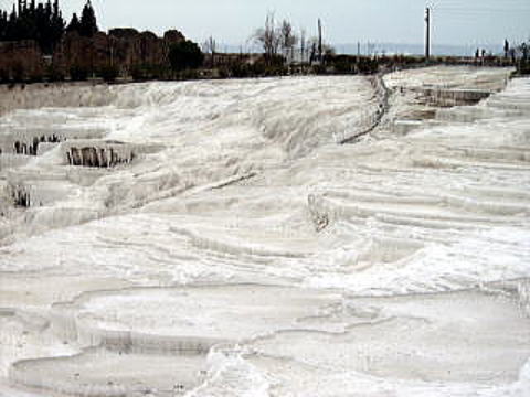 カッパドキアの温泉じゃら流出する成分が白色の”棚田”状の斜面を作り出す。