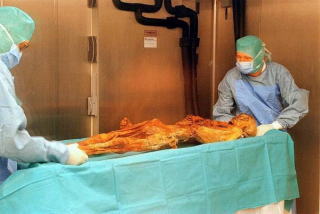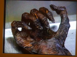 ![]() ボルツアーノ考古学博物館(イタリア) ![]() アイスマンが見つかったチロル/イタリア国境の山々 オーストリアのインスブルックにしばらく滞在して、アルプスを満喫した あと、チロル地方を経由して、北イタリアへと峠越え。初夏の山岳路をたっぷり楽しんだ。 「そう言えばこの付近の山だったよな。例の5000年前の男」 「アルプスじゃ5、.60年前に遭難した登山者が氷河の末端から見つかったりするから、氷河に遺体が残って居たと言っても、そう珍しくはないね」 「そりゃそうだけど、5300年前というと、日本じゃ石器時代だぜ」 そんなことを話しながら。峠道をのl彫り続けた。雪の切り通しが峠には幾つもあり、それ自体が結構なお楽しみコースでもある。 ![]() 左/アイスマン発見場所。右はアイスマンの想像図 アイスマンを見るためにボルツアーノへ向かったのではない。イタリアを縦断しながら脊梁山脈みたいにイタリア中央部に連なる小さな村や街を見ようという腹づもりだった。 しかし、アイスマンの遺体が博物館に展示されていると聞いていたので、通過してしまうのでは悔いが残る。そこでボルツアーののl街に泊まることにして、峠を下った。 アイスマンが発見されたのは1991年だから、訪れた時には運良く、アイスマンの研究が進み、最近の登山者どころか、5000年を超える大昔の男と分かった。それも肩付近に大きな傷があり、頭部にも損傷が見つかるなど、勘ぐれば、幾らでも男の行動を推測出来る要素も提供されていた。 考古学者や一発狙いの物書きが群がった。世界中で作家から本格的な考古学者まで、自説を振りかざしての出版となった。なーに。本当の事は分からない。部族紛争で追われ、峠近くまで逃げてきた男は、矢で射られた傷が災いして力尽き、追いすがったベつの男に石で殴られ、転倒した-。そんな話が主流だった。 しかし、負けない学者は猪野中の残存物などから、男はふもとの村で戦の傷が元となり死んだ。数ヶ月後に、遺体は山に運ばれた-。こういう説を唱える人もいた。夢やロマンの詰まった話で、ワシも読ませて貰ったっけ。 ![]() 上の2枚はのぞき窓から似たアイスマン。温度、湿度ほかを厳重に管理されている ![]() 左は検査の様子(博物館資料)。右はのぞき窓から。よく見ると左手を右に投げ出している ![]() 5000年前の人と分かり、多くの人が遺留品探しに山へ ところでアイスマンの解凍調査によると、髪の色は茶、肌は白、身長160㎝,体重0㌔、年齢は47歳前後、血液型O型、小麦を焼いてパンを食べ、動物の肉やハーブ類も接種していたようだ。また、内臓器官の位置に入れ墨の跡があり、現代ん新旧のツボと一致するという。かなり高度な医療技術があったと推定できる。 . |