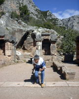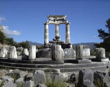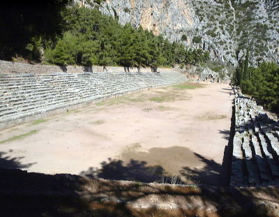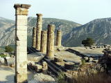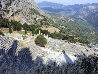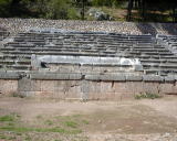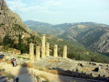 デルフィは古代・全世界の中心と考えられていたそうです。アポロン神殿が中心で、かなり急な斜面に遺跡が続いています。劇場はギリシャ世界共通の半円形の観客席があり、やはり半円系の“舞台”は、音響効果が素晴らしく、天井桟敷にいても、舞台で手を叩くと明快に聞こえるし、普通会話も出来ます。