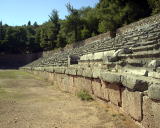 競技場は今でも使える状態です。やはり山を削って作られています。スタート地点には神の鎮座する“祠”のような石作りの小屋があり、その前に横一線の石が並んでいます。石には2本の筋があり、スタートの際に足の指を引っかけたようです。構えては見たものの、サマになっていません。