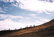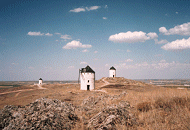 アルカサールの町から約7km、白い家並み、乾いた褐色の大地、白い雲が浮かぶ丘の上にの10基の風車が並ぶ。