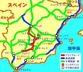 マドリッド(Madrid)−トレド(Torledo)−コンスエグラ(Consuegra)−プエルト・ラピセ(Puerto Lapice)−アルカサール・デ・サン・ファン(Alcazar de S.Juan)−カンポ・デ・クリプターナ(Campo de Criptana)−エル・トボソ(El Toboso)−コルドバ(Cordoba)