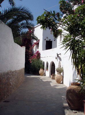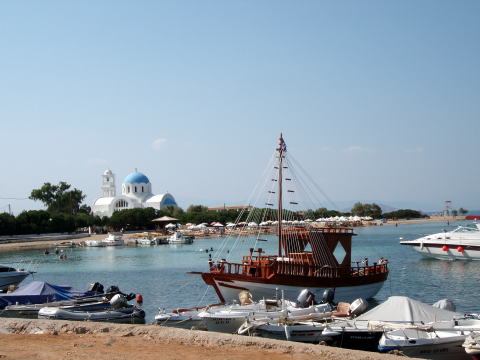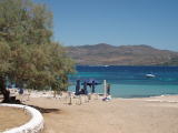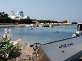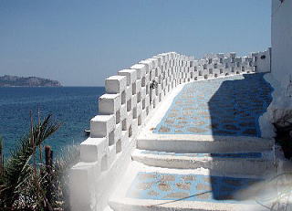 上の写真は港から西を見たところで、白とブルーの教会が目立ちます。東側はお洒落ですが、人影はまばらで、泳ぐ人はいくらもいません。白く塗った家の壁や崖際の階段などは、部分的ですがミコノス島より綺麗です。ミコノスは観光客相手の客引きや、とってつけたような貴金属店などがあり、ド田舎なのに気取ってみせるのです。
