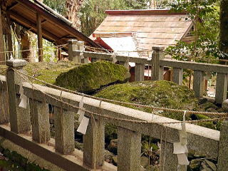 左・出雲の地を感じさせる太い注連縄。 右・囲いの中には大きな石。この下に猪と見誤った岩が封印されている