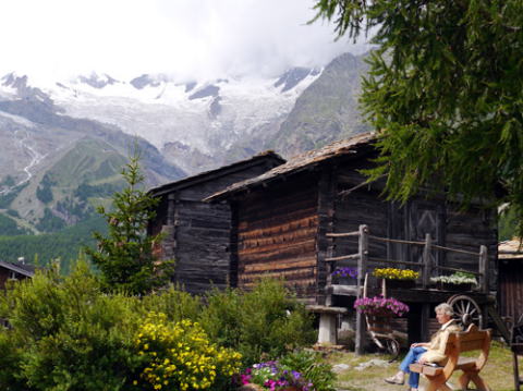 天候が今ひとつなので、ツェルマットから山へ上がりトレッキングの予定を変更して、サースフィーへ行ってみることにしました。モンテローザ(4634㍍)の北側の山群が村の背後にそびえ立ち、大きく割れた氷河がのしかかるように岩壁にへばりついています。氷河スキーも盛んなところですが、スキーのできる一帯は「閉鎖」のサインが出ていました。