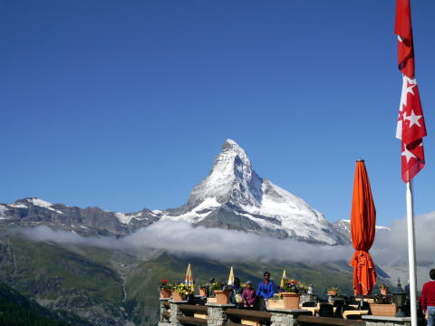そう言うわけで、ツェルマットへ下り、晴れ上がったマッターホルンを見ながら、ビールで乾杯です。何のための乾杯か、それは分かりませんが、アルプスに若き日の情熱を燃やした、日本の大衆登山パイオニアたちの快挙に、乾杯と言うことになるのでしょう。