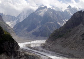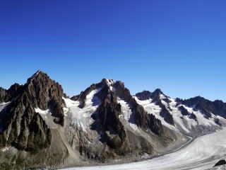 大きな氷河の周囲に、ドリュー、グランシャルモ、グランドジョラスなど3500メートルを超す山々が見えます。見えると言うよりその谷に入り込んでいるのが登山電車のモンタンヴェールの終点です。シャモニーから25分ほどアブト式レールでゆっくりと上ります。1930年代に完成した当時、氷河は駅のすぐ横まであったと言いますが、今はずっと下で氷河へはロープウェーで下るか、1時間ほどかけてトレッキングルートを歩くことになります。
