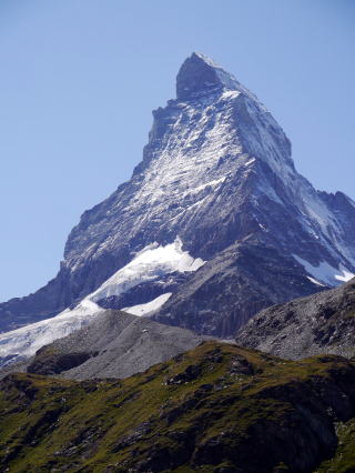 その山はチェルヴィニアからくっきりと見えました。堂々とした姿ですが、スイス側とは大きく様相が異なりました。スイス側は姿が独特で、人気がありますがイタリア側も素晴らしいものでした。セルヴィニアの街もガイド祭りでレストランのテラスで昼を取っていたときに、何人ものニッカボッカ、背広にピッケルやザイルを持った年配の人が通りました。聞いてみると「ガイド祭りはシャモニーと同じ日に昔からやっている」そうです。ウィンパーがマッターホルンを初登頂したその日、目に見える差、わずかな違いで初登頂を逃したのは、イタリア側から登ったチェルヴィニアのガイドたちだったと聞きました。