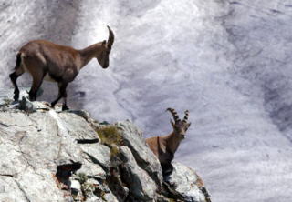 山の天気が変わりやすいのは承知ですが、ツェルマットで昼飯を終わった頃にまた天気は回復しました。それではというのでゴルナグラードへの登山電車で3100㍍まで上りました。ブライトホルン(4164㍍)、モンテローザ(4634㍍)などが大迫力です。ゴルナグラードから氷河へと落ち込む岩壁も急峻でアルプスアイベックス(写真)が、氷河まで一気に落ち込む岩場を上手に移動するのには驚きました。