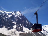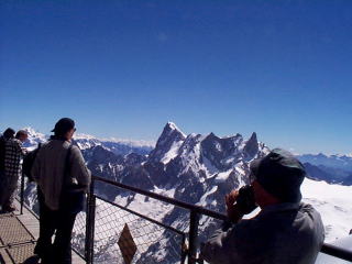 シャモニーでもっとも人気があるのはエギュー・ド・ミディへのロープウェイです。シャモニーの谷から見ると、岩壁は上部で細くなり、鋭く尖っています。あ んな所まで行けるのか―、と思うくらいですが、ロープウェイの頂上駅にはテラスがいくつかあって、階段で上ります。素晴らしい展望は言うまでもありません。