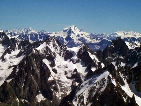 たピークを幾つも重ねています。エギュー・ド・ミディへ上ったときは素晴らしい好天で、遥かにマッターホルン(右写真尖った白いピークの右、三角形の小さな岩山)も見えました。