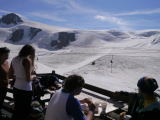 目的はセルヴィニアからゴンドラを乗り継ぎ、夏スキーの大ゲレンデのある3500㍍まで上りました。ゴンドラの終点はスイスとイタリアの国境です。広々とした氷河にゲレンデが整備されています。クライネマッターホルから大きく迂回した斜面が続いていて、ツェルマットからケーブルを乗り継いでクライネマッターホルンまで上ったスキーヤーも、この斜面で滑ることになります。