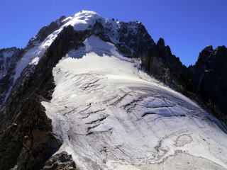 シャモニーの隣り村、ア-ジェンティエールからロープウェーを乗り継ぎ、グランモンテ(3295㍍)まで上りました。目前にドリュー(3754㍍)とプチドリューがそびえ、ドリュー=写真・左=に向かって右側に見えないけれどメールドグラスの深い谷をを隔ててエギュードミディ、モンブラン(4810㍍)。大きく左に目を転じるとア-ジェンティエーレ氷河をはさんでエギュードシャルドネ(3482㍍)、エギュードア-ジェンティエール(3877㍍)=写真・下=、氷河の奥にはイタリア国境にそびえるモンドレン(3823㍍)などが氷河を抱いて連なっています。
