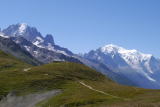 モンブランもドリューもトゥールから登った峠から見ると、シャモニーとは様変わりです。くっきりと晴れたトレッキングは快適です。しかし、山が大きいのですぐ近くにあると感覚的にとらえても、実際はかなりの距離があるのが普通です。こういうことはなかなか慣れません。生まれ育った地域や自然を本能的に記憶しているので、あえてここはアルプスだ、と念を押さないとトレッキングでも疲とにもなりかねません。