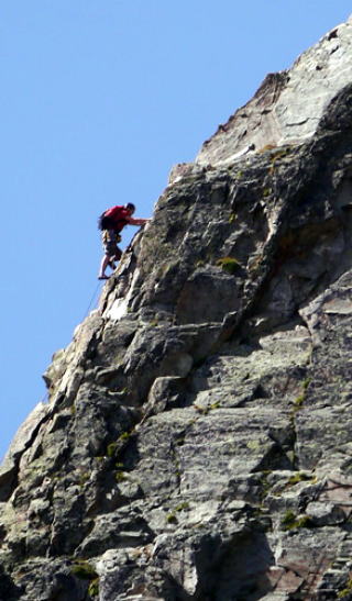 もっとも注目され高く評価された登攀は、フランスアルプスのペイン・ディ・スクレディ・ソレイユ-(3130㍍)で、天空を突き刺すようにそびえるピークの頂上に達するルートは、600㍍に渡るフェースを通過しなければならない。難易度で5級、もっとも難しいランクだ。ディボナが、オーストリアのクライマー、ギド・メイヤーとともに開拓したこのルートは今でもクライマーたちがたどっている。