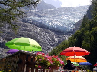 シャモニーの谷から山へ上がっているロープウェーにはあらかた乗ったし、トレッキングも気の済むくらいやりました。スイスのツェルマットにいたとき2日ほど雲がおおかったのですが、その後は大方、晴れ続きで、マッターホルン、モンブランをはじめ多くの山々が、くっきりと青空に稜線を描くのを見ることができました。シャモニーの谷でもアーゼンティエールやトゥールの谷、さらにはボゾン氷河が目の前に迫るボゾンの小屋=写真=まで行ったのは、拾いものでした。