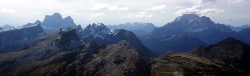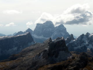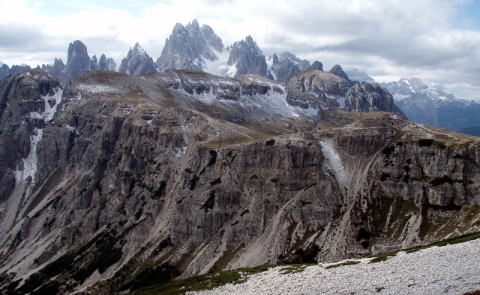 チンネの岩壁から目をそらし、南方を見るとドロミテの針峰群が展開する。氷河に削られた深い谷から、岩壁、岩稜が一気に突き上がる。その先はまた分かれた針峰となり、尖ったピックのように空を突く。アルプス、ことにドロミテでないとこれほどの針峰群は見ることが出来ない。好天に恵まれれば、それは素晴らしドロミテ展望のトレッキングが約束される。