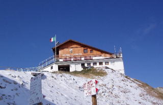 ロープウェイの頂上駅から100㍍ほどにラガツォイ小屋 がある。イタリア、オーストリア国境に近く、初秋だったのでうっすらと雪が積もっていた。夏姿の観光客もロープウェイで上ってくるが、雪の斜面を小屋まで登るのに一苦労していた。