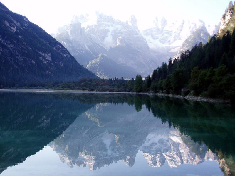 左はチンネを下り、オーストリア側へと下りたところの湖、ディランドロ湖の湖面に映るチンネ。光の加減でカメラは得意ではないので、山は飛んでしまっている。しかし、湖面に露出が合っていたのだろう、映った方が正直にチンネの姿を見せてくれている。