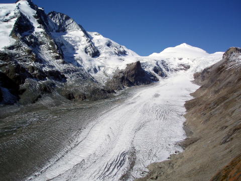 氷河にはトンネルが掘られ、内部を観るように作られていますが、以前のトンネルの跡が露出して氷河上に残っています。1年に4~5㍍は溶けているというのですが、まだ氷りは150㍍ほどの厚さがあるそうです。オーストリアのグロスグロックナー氷河も、ケーブルカーが昔は氷河まで降りていたそうですが、今はケーブルカーの駅から数百㍍も下らないと氷河には触れられません。アルプスは年々、様変わりしています。