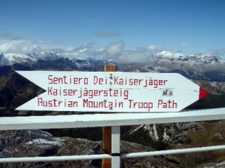 ラカツォイ・ビッチョレ山へは、細い岩尾根をたどる。そこには「オーストリア山岳兵の道」と書かれた表示があった。道とは書いてあるが、もちろん道などない。岩場をたどるだけなのだ。岩尾根は両側が切り立ち、相当な高度感がある。山頂は見えているし、簡単にいける距離だが、岩尾根はそう易々とは通してくれない。