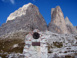 駐車場に車を駐め、目前にドカンとそびえるチンネの岩峰の下をずっと横切っていく道をたどり、回り込んで小屋が見えなくなたあたりに、グローマンの記念碑がある。チンネの主峰、チメ・グランデ(2999㍍)だ。それをかたどった岩に顔と名前、年代のレプリカが埋め込まれている。背景はもちろんチンネの岩峰だ。グローマンのたどったルートは、現在でもチンネ主峰を登攀する一般ルートとなっている。