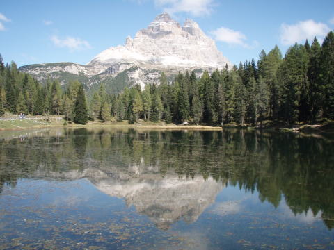 ミズリーナ湖の澄んだ湖面にに映るチンネは素晴らしい。初秋に行ったのでちょっと降った新雪が岩峰の下に残り、湖を取り巻く針葉樹の青が岩峰と僅かな雪を引き立てている。