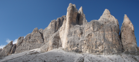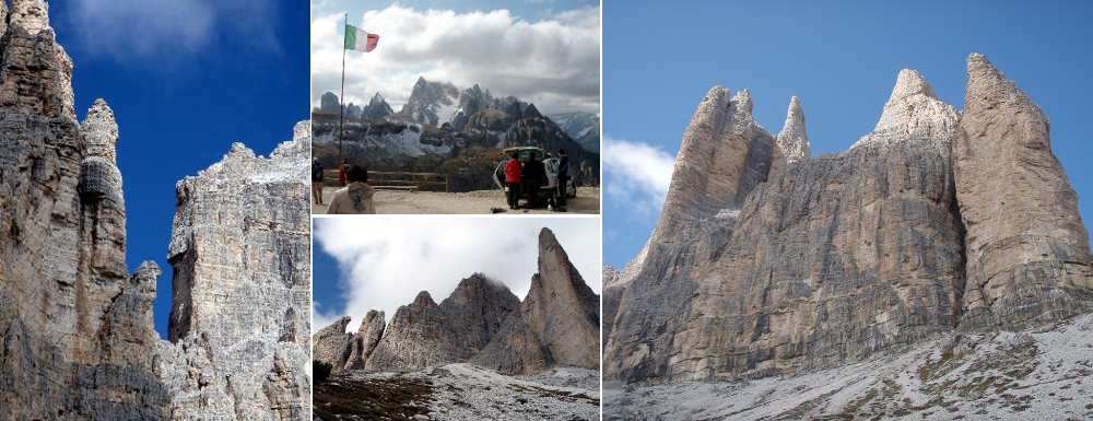 dドロミテの山群を代表する岩峰は、ヨーロッパ・アルプスの名峰の1つで、稜線はイタリア、オーストリアの国境にもなっている。イタリア名はトゥレ・チメ・ディ・ラヴァレード(Tre Cima di