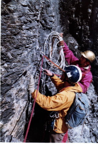 「高田さんの説明通りの場所に風雪で脱色され白っぽくなったザイルがありました。岡部勝さんに確保して貰い、私がザイルを回収しました。写真は右が岡部さん、岡部さんを確保しているのは中野亮さんです=写真・撮影・手島=。中野さんはその後、ヒマラヤの雪崩で遭難死しています」と手島さんは回想していました。