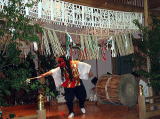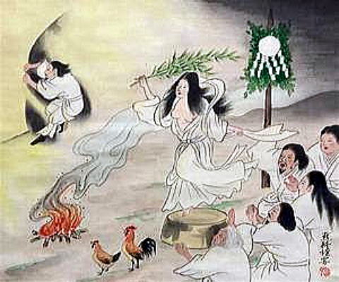 天宇受売命(アメのウズメのミコト)が登場。カズラを頭に巻き、笹の小枝をサヤサヤと鳴らし、伏せた樽ン上に乗ってドンドコドンドコ踏みならした。前代未聞の騒ぎとなり、神々は大騒ぎ。アマテラスも何が起こったのかと岩戸から覗き、次いで体を出したところを天手力男神に引き出され、世界の光が戻ったのだった。