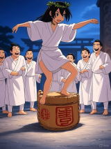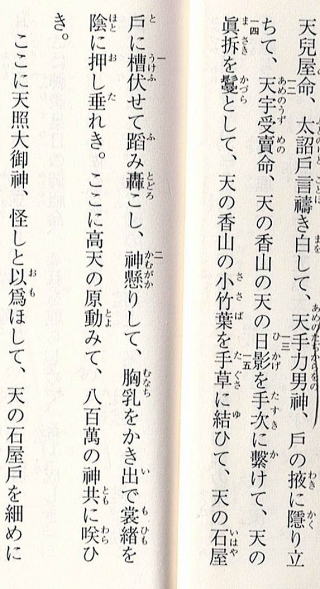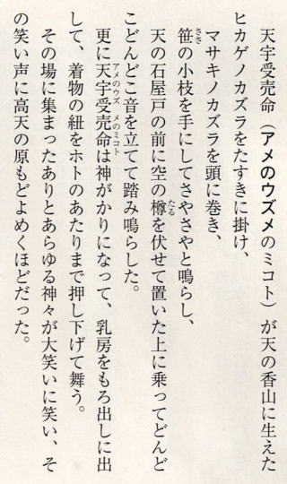 ![]() 遙か昔のその昔。辿ってみればまだ昔。神代の時代から伝わるは、天の石屋戸(天の岩戸)の物語。 と言う訳で、今回はちょっと砕けた“真面目な話し”の特集ですョ。 話しの主は天宇受売命(アメのウズメのみこと)です。知る人ぞ知る、元祖日本のストリッパー。疑い深いお方にはまず原文とその訳2本。人により訳すタイプが大きく違い、読み比べると面白い。 ![]() 現代の“ウズメちゃん”ならこうなるか?(grokAIで生成) 右は原文。左は岩波文庫の現代文。 原文(右)の右から2行目。天兒屋命、から八百万神共咲くまでが岩波版の訳。 こちらは河出文庫 ![]() 上記、右の天受売命から。 「胸丸出し、紐をずらして…、なんて原文には書いてないだろう」と言う声が聞こえてくるようだったので、原文のコピーを掲載した。こちらを読み通せ、と言われても「そりゃないでしょう」と逃げるばかりですよ。ただ、絵本や教科書的な本は、上手に逃げているので、原文もそのようになっていると考えてしまうが、上記のようにきちんと書かれているのです。 ところが今、凄い勢いで伸びているAIで“お絵かき”にチャレンジ。丁寧に「プロンプト」(指示書)を描いてためしたら、マイクロソフト系、Google系ともに、AIの規定か何かがあるようで「この絵は描けません」というような返答が来る。おそらく、エロっぽい絵にでもデフォルメされてはたまったもんじゃないので、どこまで描けるかの止め所を決めかねているのだろう。個人用AIなら何でも描けるだろうが、無料AIではやむを得ない所かな。いくつかのAIからの返答とも思える絵を掲載します。 ![]() ![]() 左上が注文に近いですが、ストリッパーにはチト余計なものを付けすぎです。お姉ちゃんは「かわいい系」で笑っちゃう。浮世絵風を注文したら、下の左になっちゃってた。フラメンコ風お姉ちゃんはこりゃ古事記には居ませんなー。 |