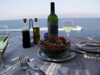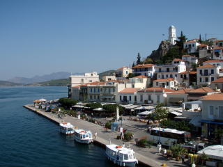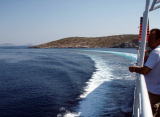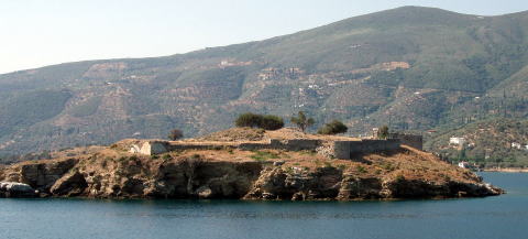 島を出て南下する船から、要塞の島が見えます。古代からあったようですが、中世に補強され今は廃墟です。写真の後ろがペロポネソス半島のまた半島です。島とは指呼の間で、地元の人は小さな舟で行き来しています。大型船の通る水道で、子供たちが泳いでいました。船は汽笛を鳴らして通ります。