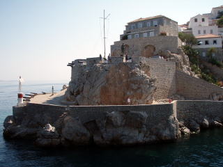 港の入り口には砲台があります。反対側にはレストランや泳ぐ所があります。ビーチではなくやにわに深い海です。泳げない人はタクシー(船)で10分ほどのビーチへ送り迎えしてもらわなければなりません。