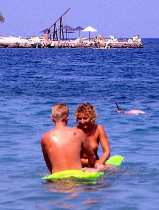 だからといって、ほんのたまに見かける日本人は、やっぱり水着を着けています。習慣というのか文化というのか、どっちでもいいことですが、ギリシャでは地元のお婆さんも、モッタリと膨らんだ体で何とも言いようのないビキニ姿でビーチ、時には街を闊歩します。