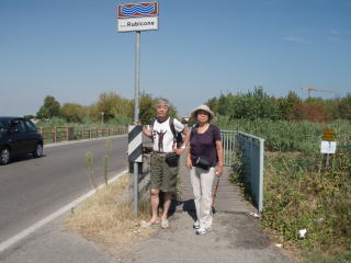 高速道路A14の高架線道をくぐり、鉄道の踏切をわたるとサヴィアーノ・スル・ルビコネ(Savianano・Sul・Rubicone)という町に着いた。川幅は橋の架かっている付近だけ、少し広いが、水量は少なく、騎馬の騎士が水しぶきを上げて駆け抜けるような所ではない。頑丈そうな石の橋が石造りの民家の続く町並みをつないでいた。