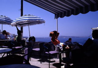 ビーチ近くには洒落たレストランやカフェがあります。ギリシャ国旗をあしらったパラソルや日よけが雰囲気を出していました。