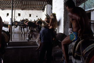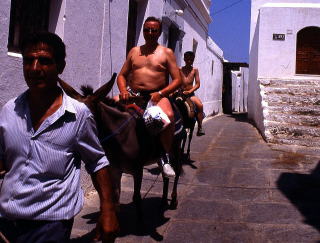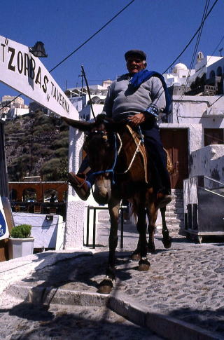 “ロバ・ターミナル”やロバ溜まり?があります。熱いのにご苦労さんで、歩く人もいますが、たいがい音を上げてロバにします。途中で乗っても、港からと値段は変わらなかったように記憶しています。