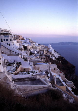 サントリーニは火山島です。緩い斜面と古い火口壁の急斜面があります。フィラの街は崖にへばり付くホテルやレストランが階段状に並んでいます。島は三日月型をしていますが、紀元前1500年頃の大爆発で、島の西側が半分近く吹っ飛んでしまったといわれています。