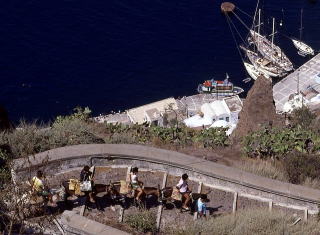 大きな船はアティニオス港に着きますが、クルーズ船や小型の船は、フィラの街の崖下にあるオールドポートにも入港します。ここが1つの名所です。
