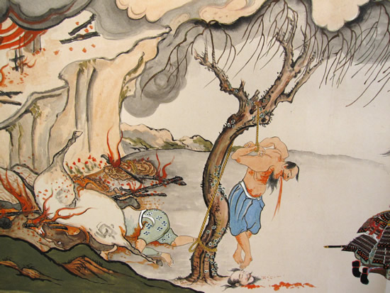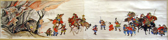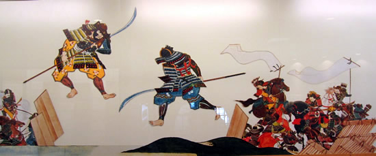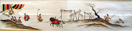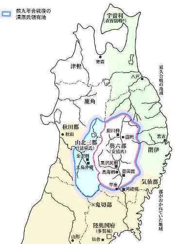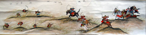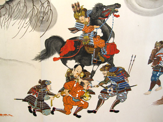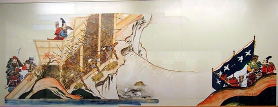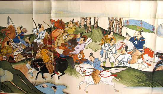 ![]() ◆戦いの状況 前九年後三年の役は平安時代(782年~1190年)の中頃から終わりに近い、1050年以降に東北地方で戦われた。先に起こった戦いは、前九年でいったんは治まり、その後、再び勃発したのが後三年役。中央政府(朝廷)に逆らったのが前九年で、武士同士が主導権を争ったのが後三年の役だ。 【前九年の役】 平安時代の中頃に陸奥(東北地方)の奥六郡を支配していたのは安倍氏で、中央政府・朝廷が要求する貢賦(こうふ)=税金のようなもの=を納めず安倍頼時の代になり、次第に勢力を増して、衣川の南へと進出した。陸奥の支配者とはいえ、朝廷を無視、の勢いを放置する訳にもいかず、朝廷側は陸奥守・藤原登任(ふじわらなりとう)に安倍氏を攻めるよう命じた。しかし、登任軍は敗れたため、朝廷は1051年(永正年)源頼義を陸奥守に任命し、鎮守府将軍も兼務させた。部門の雄、名将の登場で頼時は帰順して反抗は治まった。 しかし、安泰は長続きしない。頼義が任期満了の年に、頼時の子、貞任(さだとう)が人馬殺傷の嫌疑で罰せられようとしたのを不満として反抗。朝廷も改めて頼義討伐を命じるなど混乱が続いた。貞任、宗任らは反抗を止めず、1057年には頼義軍を破る勢い。衣川の南を侵食した反抗軍の中には物資調達までやる始末。これを頼義は制止出来ず混迷のうちに新たな国司が任命されたが、現地の武士は新国司に従わず、頼義が引き続き指揮を執ることになった。 ここで頼義は出羽仙北の豪族清原氏に接近し、援軍を得て反抗する貞任などの軍勢を小松柵、衣川関、鳥海柵、そして厨川柵を落とし貞任を殺し、宗任らを降伏させた。頼義は朝廷から伊予守、長氏、義家を出羽守、武則を鎮守府将軍に任じた。この役で頼義は東国武士団に手厚い恩賞を付与する努力をした古都で、武士団からの厚い信頼を受け、固い結束、信頼関係が出来上がったと言われる。 ![]() 【後三年の役】 清原氏は武則が鎮守府将軍となり、思いもかけずに東北での勢力拡大のチャンスを得た。安倍氏の領域だった地域 そこへ源氏の戦闘的武士団の長、源義家が1083年(永保3年)陸奥守となって赴任し、騒動に介入。真衡を助け、清衡。家衡を敗走させた。これで落ち着くかと言う時に、義家が助けた真衡が急死して仕舞った。敗走した清衡、家片は義家の計らいで奥六郡を二分して分け当てたが、今度はその取り分で両社の間で争いが起こった。さらに義家が清衡を助けて家衡を攻めたが、大雪のために撤退。これを知った家衡の叔父・武衡が家衡につくなど、親族での争いが続いた。 「雁の隊列の乱れで敵の伏兵を知った」古事は、義家が武衡郡を攻めた時の逸話だ。このほかにも義家の弟、新羅三郎義光が義家の加勢に官職をなげうって都から駆けつけたことなど、源氏の結束力が顕著になっていく戦いでもあった。朝廷はこの戦を義家の私闘と解釈して恩賞などはなかった。奥州の勢力は清原氏のものまでを含めて清衡が継承。平泉の本拠を構え、平泉藤原氏三代にわたる栄華の根拠をを築いた。 (参考データ、及び絵図などは、横手市観光協会、横手市公式ページ、国立美術館、ウイキペディアなどによる) ![]() 金沢柵を攻める景正軍 中央の権力が、漸く地方を支配する力、組織力を持ち始めた頃、関東から西を抑えた朝廷は、独自の生き方を続けて来た東北地方の豪族へと、支配を拡大していた。地方それぞれが力を持ち、朝廷の権力支配のもとに税金を納め、人を出してバランスを保ってきたが、中央の支配力が地方豪族を明らかに上回るようになったのが、前九年の役=1051年(永承6年)~1062年(康平5年)=、後三年の役=1083年(永保3年)~1087年(寛治元年)=の結果ということになる。古代から中世へー。そんな日本列島の支配形式の変化と重なり合ったのが、前九年,後三年の役となる。 戦はいつの時代でも悲惨で残酷なものだが、古代から中世の戦いは残酷ではあってもいかにも人が戦い、そこにいる人々の息吹が聞こえて来るようだ。 ○…陣頭に立ち激を飛ばして進軍。そこへ一本の矢。景正の 右目に突き刺さる。部下の一人が景正の顔を足で押さえ矢を引き抜こうとするのを振り払い、自ら引き抜いて進んだと伝えられる。 ![]() 両軍勇士の一騎打ち ○…切り立った崖に囲まれた金沢柵は守りが強い。藤原清衡、弟の義光が同盟軍をつくり2万人の大軍で攻めたが膠着状態となった。1087年のことだった。籠城するのは清原家衡、武衡以下3千人。膠着状態を打破しようと両軍が「勇士を一人ずつ出して一騎打ちをさせよう」と言う提案に賛同し、長刀を振るっての一騎打ち。右の武士団中央で馬に乗っているのが義家。 ![]() 攻めあぐむ義家=右・旗の下、に向かって、沢山の矢がの突き刺さった台上から義家を罵倒する藤原千任(ちとう)。いわく「お前の父、頼義は先の合戦で安倍貞任を攻めきれず、清原と武則将軍の力を借り、漸く勝った。その恩を忘れて柵を攻めるとは、恩を仇で返す暴挙」と大声で繰り返した。 引っ立てられる千