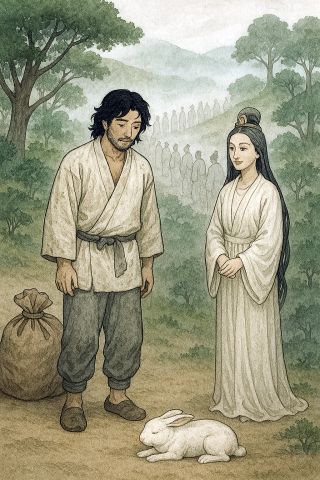 八十神に酷使される大国主命。八上比売は寄り添う(AI Copilotで生成)