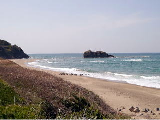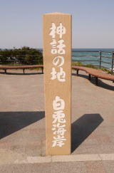 “白兎海岸”の標示が有り、まず見落とすことはありません。隠岐の島は見えませんでしたが、綺麗な海岸線が弓形に延びていて、果たして遠浅のこの海岸にワニ(鮫)が並ぶことが出来るのか-、などと役にも立たない事を考えたりしました。